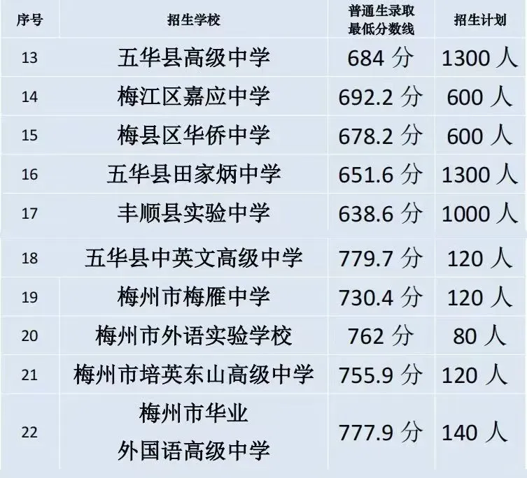 五华县中英文高级中学 | 779.7 | 五华县 | 优质民办,面向全市招生,分数线超部分公办顶尖高中 |