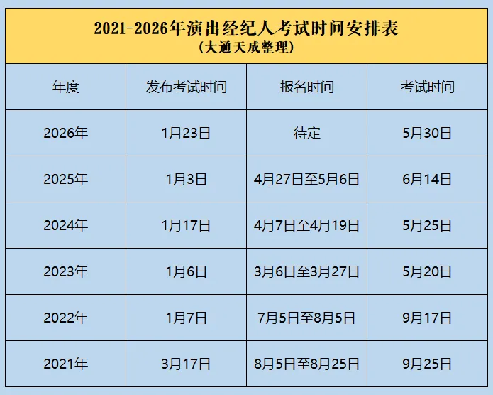 近日,人力资源社会保障部办公厅发布关于2026年度专业技术人员职业资格考试工作计划及有关事项的通知,确定2026年演出经纪人员资格认定考试将于2026年5月30日举行。大通天成给您汇总了考试的相关事宜,供您参考。全国一年只考一次,千万不要错过报名时间,考试时间。下方扫码进群随时关注最新消息。