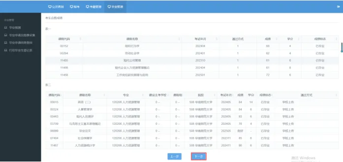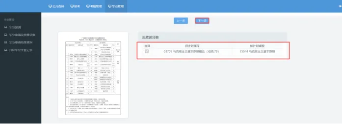 点击“毕业管理”,点击“毕业预测”,点击“下一步”;