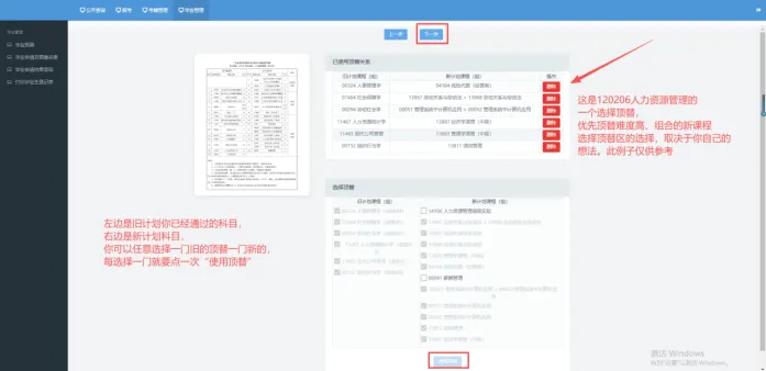 左边是旧计划你已经通过的科目,右边是新计划科目,你可以任意选择一门旧的顶替一门新的,每选择一门就要点一次“使用顶替”,全部选择后,点击“下一步”;