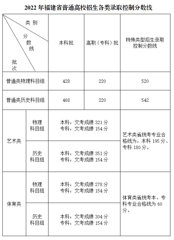 6月24日下午,福建省高等学校招生委员会召开2022年第二次全体会议,研究确定今年我省高考切线方案,部署高招录取工作。经会议研究决定,2022年福建省普通高校招生各类录取控制分数线具体如下:
