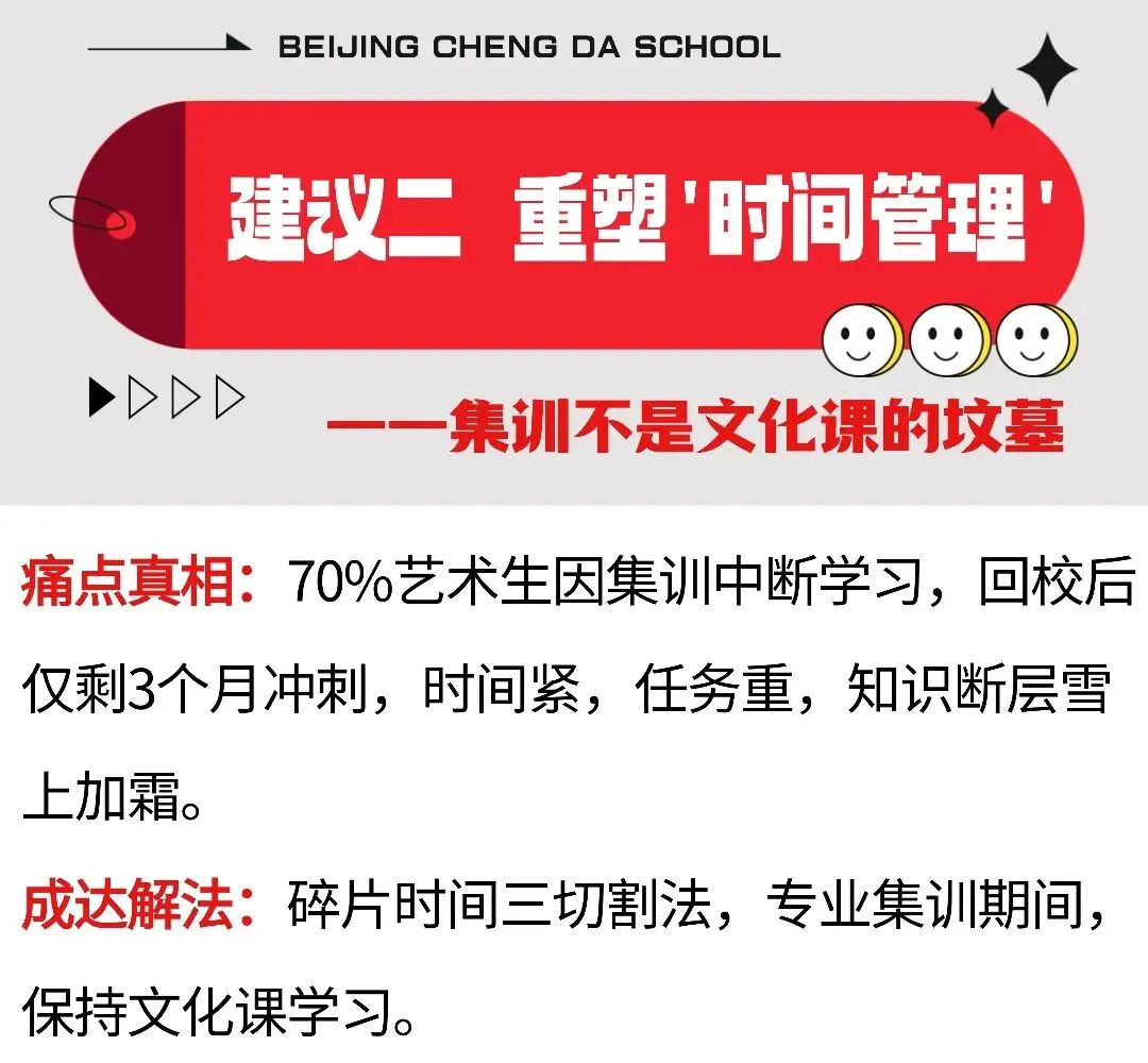 选择好的文化课培训机构:事半功倍。我们艺考生和普校生不一样,我们前期大部分时间用于专业课学习,我们专业课结束后已经不再适合回到普校学习,因为普校文化课已经完成一轮,甚至二轮复习,我们长时间没有进行文化课复习,回去就跟着普校生一起学习,我们的文化课就会脱节,因此我们应该选择专业的文化课培训机构。成达学校连续20余年专业从事艺术生文化课培训,专业专注值得信赖。