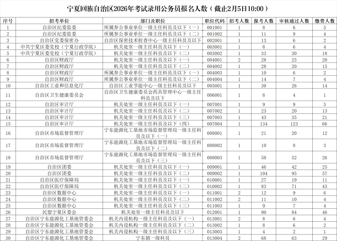 宁夏回族自治区2026年考试录用公务员报名人数(截止2月5日10:00)