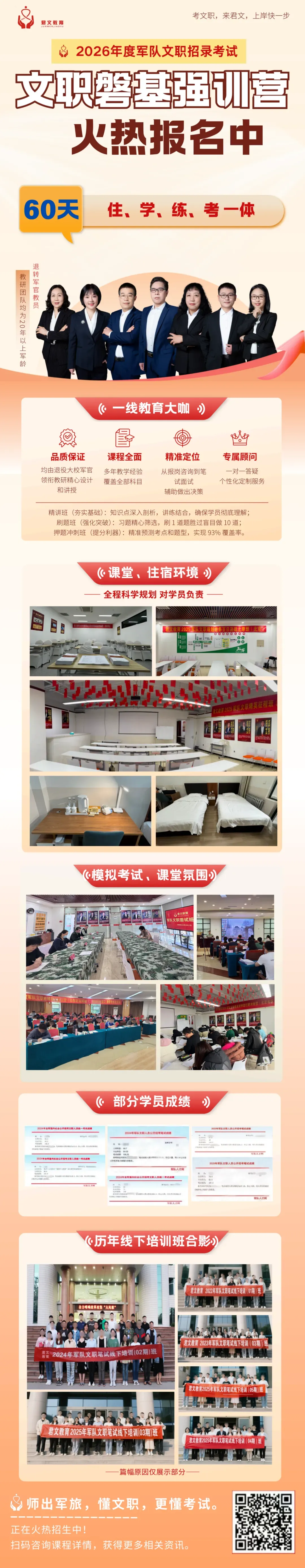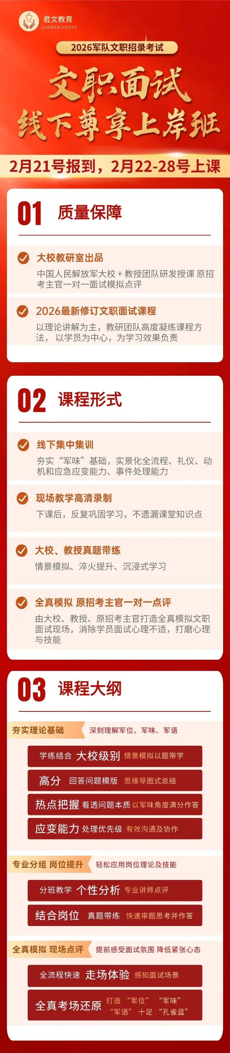 军队文职考试是一场没有硝烟的竞争,面试就是这场竞争的最终决战。君文教育会全程陪伴各位考生,全力助力大家打好这场面试硬仗,成功上岸!