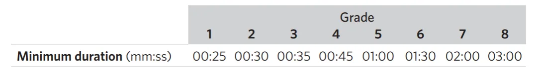 休息时长:考生如果需要,可以在演奏过程中休息一次。休息时间不得超过下列所示的时间。视频录制在休息期间不得暂停或停止。