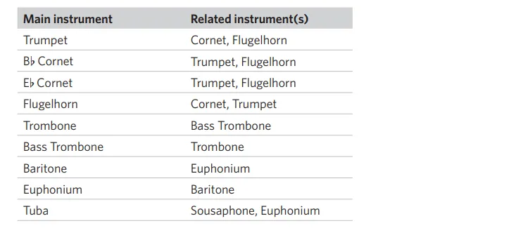 -大号:Eb,F,Eb或C 大号可用于考试。考生可以根据自己乐器的需要改编段落或转置部分和(或)伴奏。带有三个活塞的乐器可以用于所有级别的考试,考生可以改编需要第4活塞的段落。