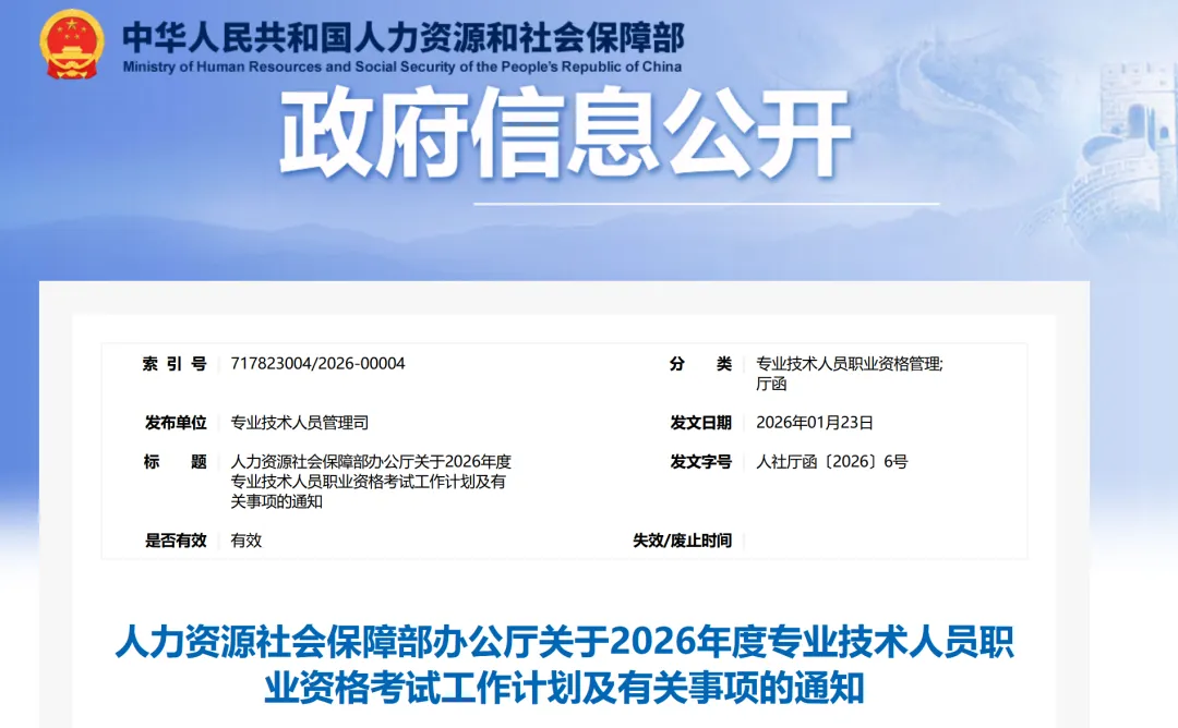 为切实做好专业技术人员职业资格考试规划与管理工作,方便广大专业技术人员参加职业资格考试,经征求有关部门同意,现就2026年度专业技术人员职业资格考试工作计划及有关事项通知如下: