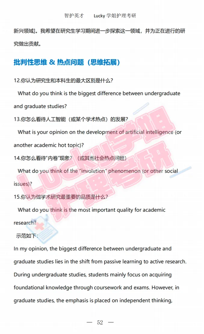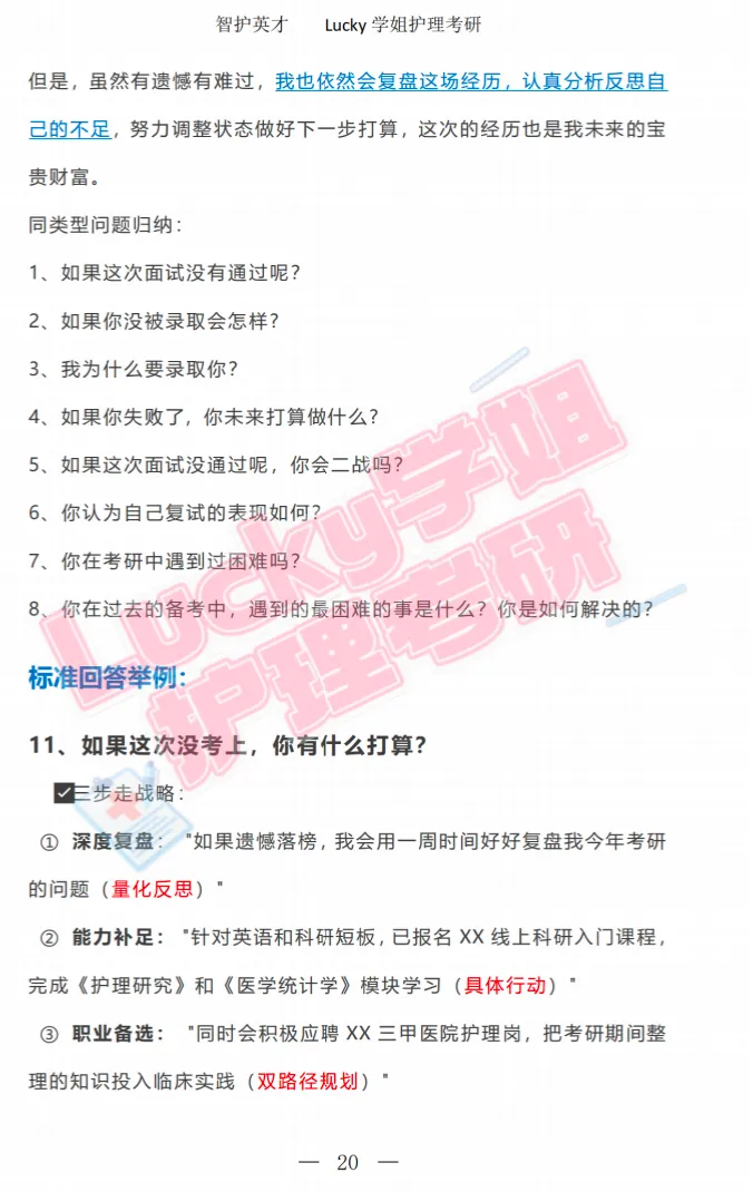 面试问答方面,要提前梳理面试高频问题,以及制作自我介绍的建立,熟悉简历内容和自己的高频问答模版是避免临场紧张的关键。「护理考研复试百问百答」包含专业知识、科研经历、职业规划、调剂问题等四大类,用针对性问题,教你避开雷区、突出亮点 —— 比如强调实习中的实操能力、学习中的抗压能力,让导师看到你的可塑性。