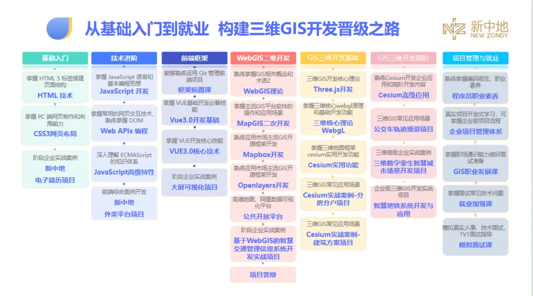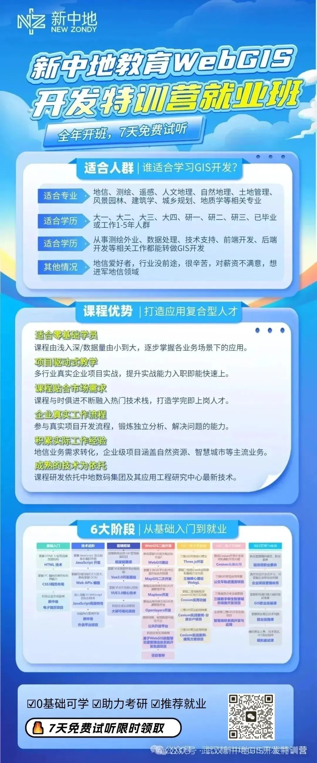 新中地GIS开发特训营学习周期为5个月,最新一期是12月22日开班,如果报名2507期,将正好赶上明年春招的尾声。