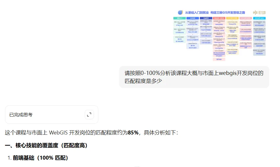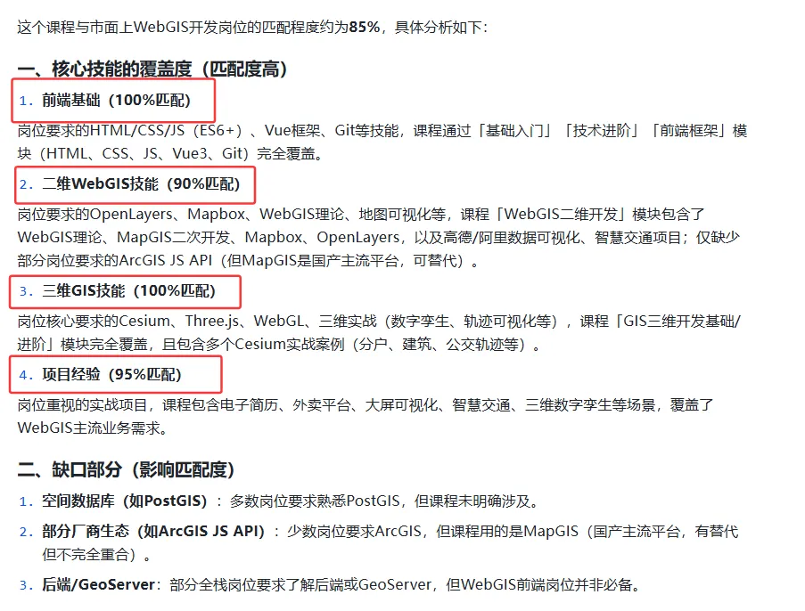 我们用AI分析了课程大纲与市面上正在招聘的webgis开发岗位匹配程度,AI给出的核心技能匹配度为100%,整体匹配度高达85%,具体如下图所示: