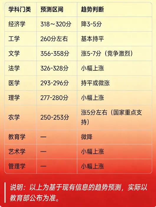 结合2026年全国硕士研究生招生考试核心数据及多重影响因素综合分析,2026年考研国家线整体有望呈现下降态势。需要说明的是,不同学科门类的降幅存在差异,学术学位与专业学位、热门专业与冷门专业之间的分数线差距较为显著,但整体下行趋势明确。具体分数线详情可查阅下文具体内容。