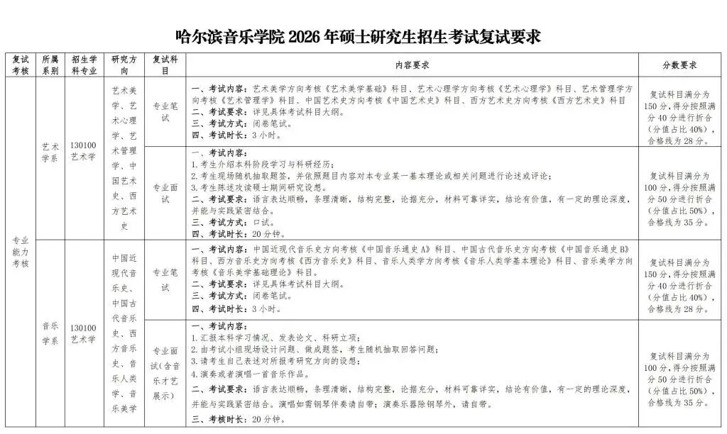 2026年哈尔滨音乐学院硕士研究生初试复试要求