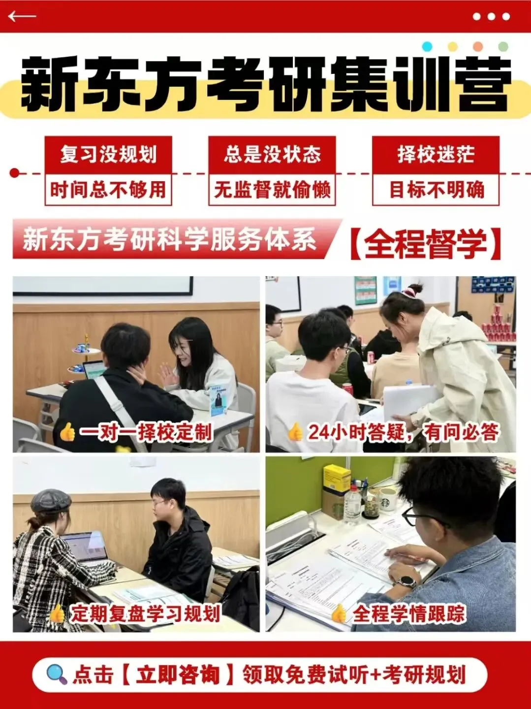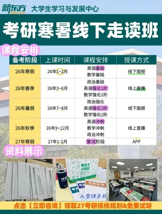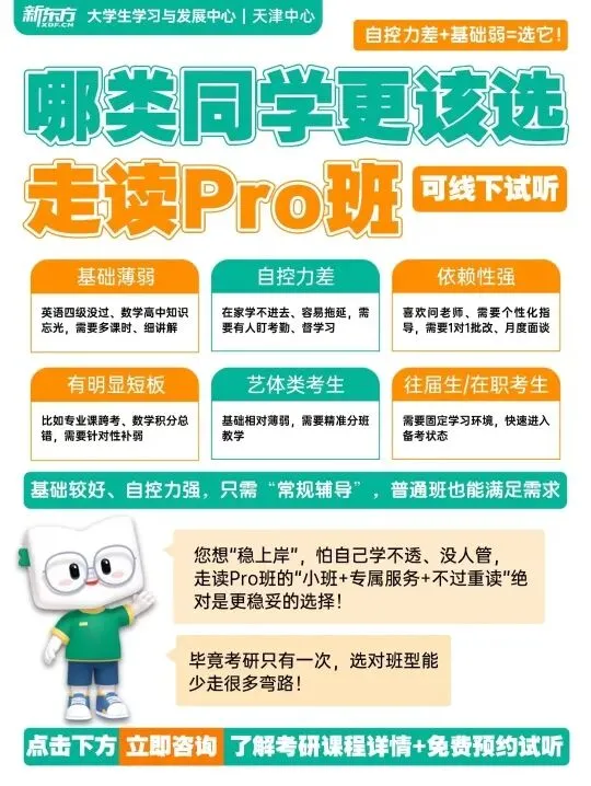 新东方考研走读班,正是为这样的你而准备。我们愿做你备考路上踏实的同行者——不催促、不喧哗,只是安静地陪在你身边,用持续的关注与支持,帮助你保持自己的学习节奏,稳步向前。