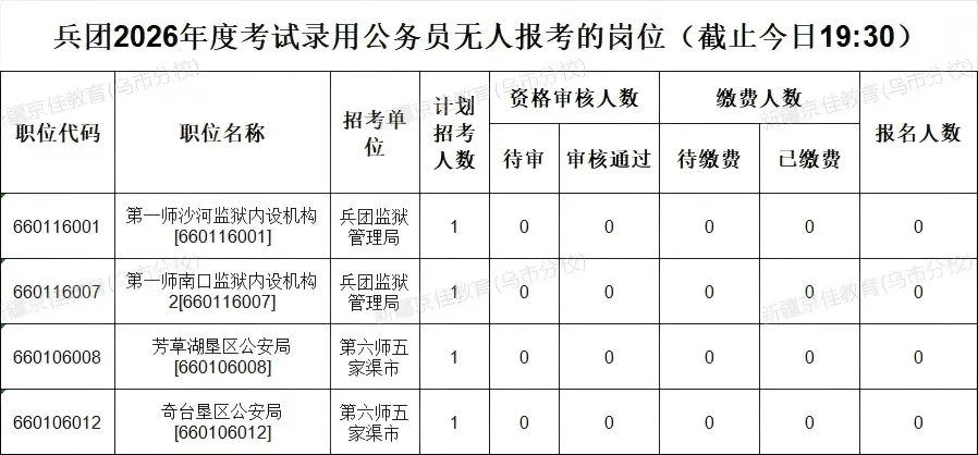 截止至2026年2月4日19:30,有4个岗位无人报考,与昨天公布的数据相比,减少了10个无人报考的岗位。此次兵团公务员招考报名将于2月6日18:00截止,还没有报名的考生请抓紧时间报名咯!具体岗位如下: