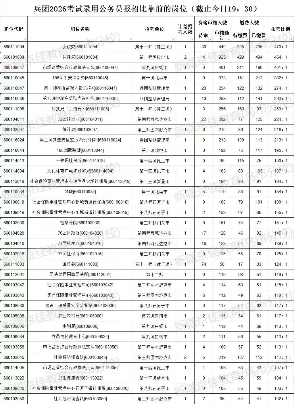 在大家参考报名人数时,小编认为报招比是一个重要的参考依据,所以小编整理出了截止2月4日19:30,报招比靠前的岗位,最高报招比为470:1。与昨日相比,仍旧是第十一师(建工师)的岗位,其职位代码是660111004,该岗位的专业、政治面貌、户籍均不限,工作地点在乌鲁木齐市,且报考年龄放宽至38周岁,因此报考人数最多。具体岗位如下: