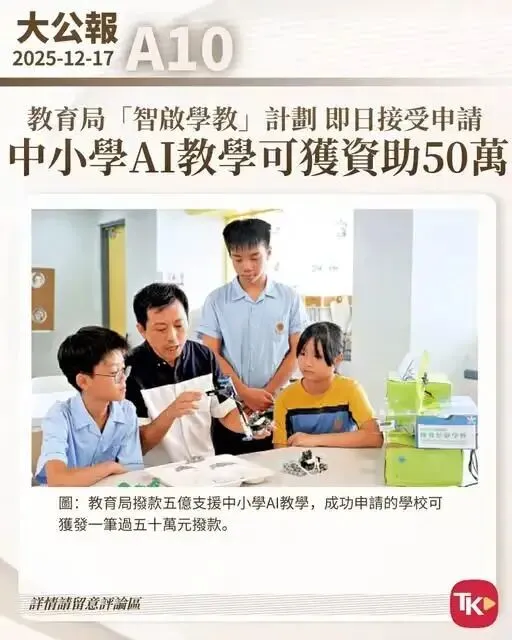 根据《星岛头条》的新闻报道,香港教育局重磅推出“智启学教”三年计划,投入高达5亿港元的专项拨款,全面推动人工智能(AI)融入中小学课堂。成功申请的学校会获发一笔过50万元拨款。这一举措绝非偶然,而是香港教育紧跟时代步伐、高瞻远瞩的战略布局。