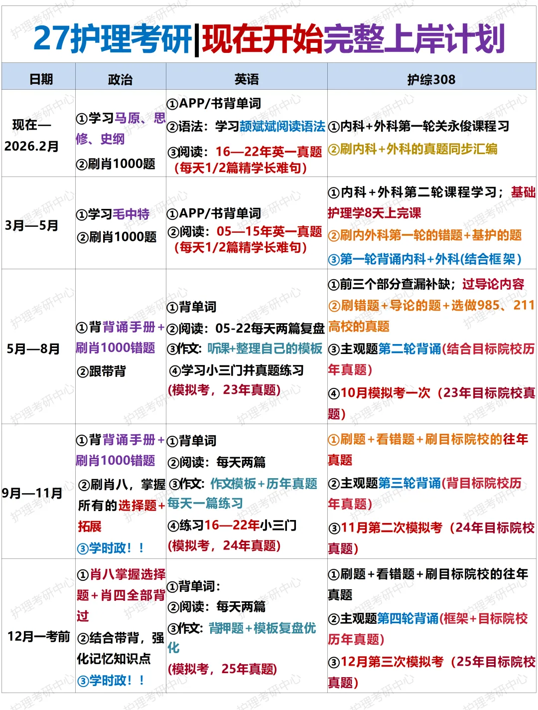 各位考研的准研一同学你们好!提前一年备考是绝佳优势:这一年里,请先确立目标院校,然后稳扎稳打地吃透内外科和护理学基础三门核心,深度理解理论,并让英语学习成为每日习惯。时间在你手中,请自信规划、从容前行,胜利终将属于坚持的你!