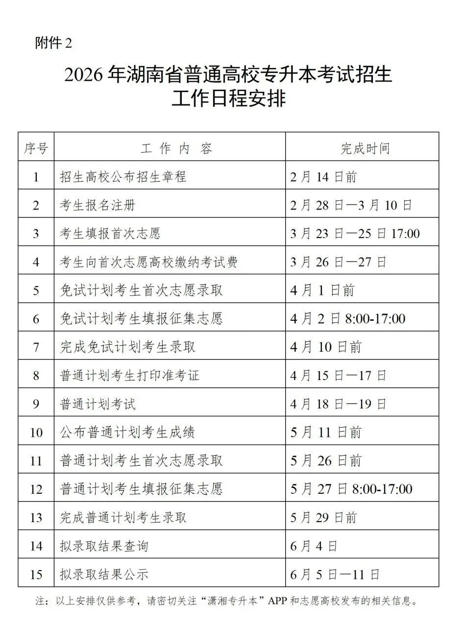 2.2026年湖南省普通高校专升本考试招生工作日程安排