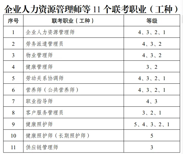 企业人力资源管理师,劳务派遣管理员,物业管理师,健康管理师,劳动关系协调师,营养师(公共营养师),职业指导师,客户服务管理员,健康照护师,健康照护师(长期照护师),供应链管理师。