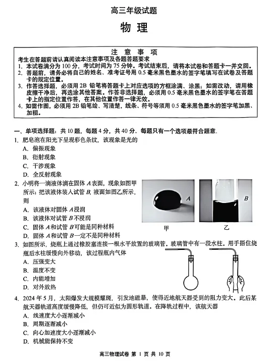 2026年无锡市高三上学期期末考试物理试卷、答案+评分标准