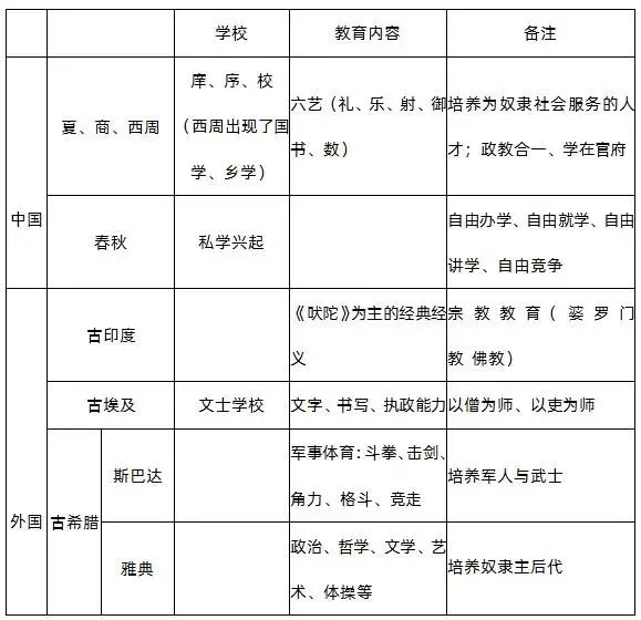 古代社会的教育包括奴隶社会和封建社会两个时期的教育(见下表)