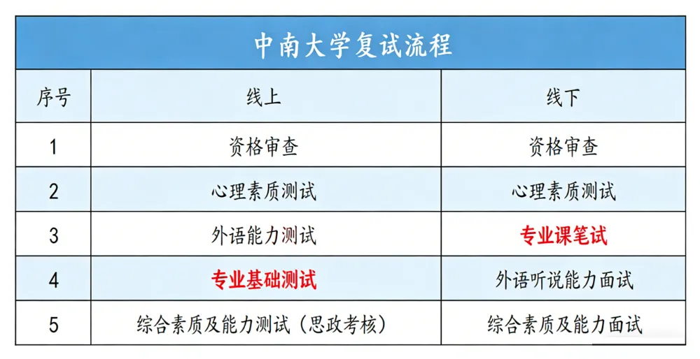 ·线上复试:资格审查→心理素质测试→外语能力测试→专业基础测试→综合素质及能力测试(思政考核)