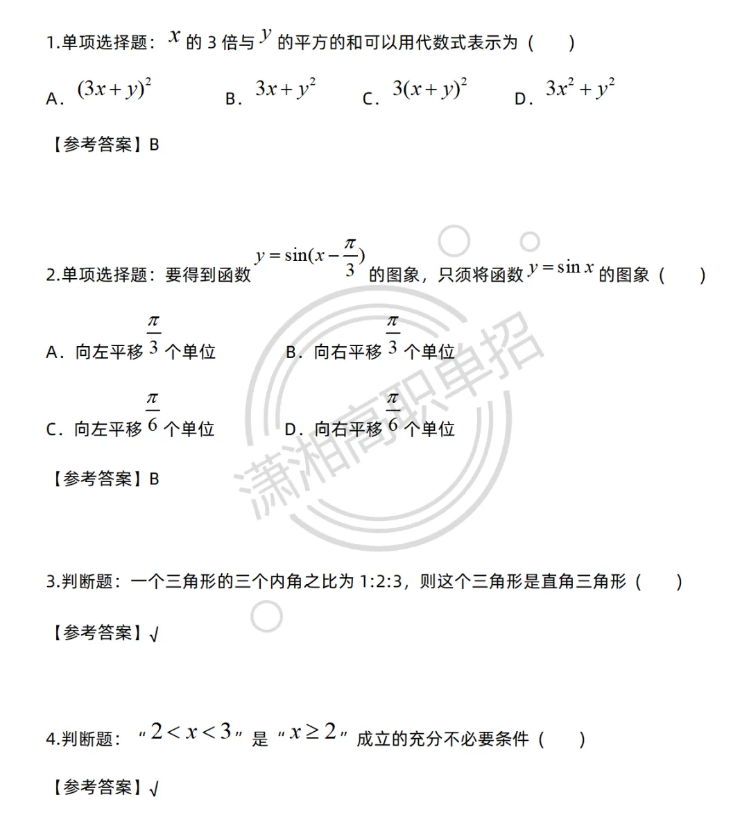 数学的考试命题范围包括:代数式、方程(组)、不等式(组)、集合与函数、三角函数与解三角形、数列、平面几何初步、立体几何初步、平面向量、直线和圆、概率和统计初步等。考试的数学基础知识是指本大纲所规定教学内容中的数学概念、性质、法则、公式、定理以及其中的数学思想方法。