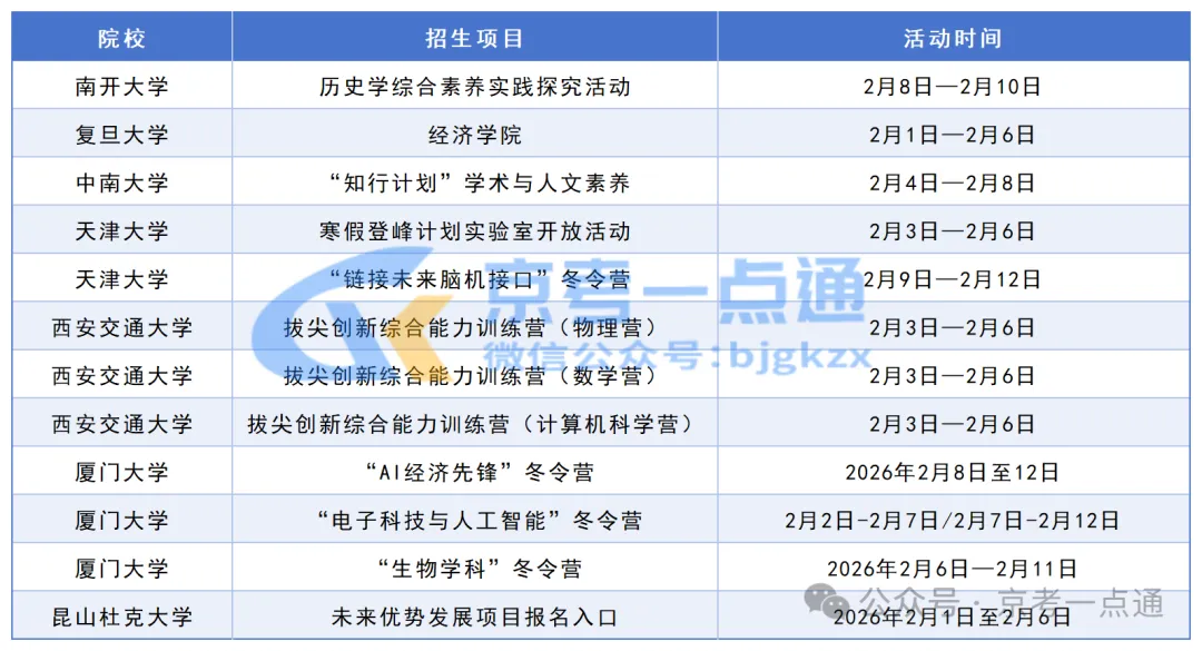 高校的冬令营是高校利用寒假一周左右时间,招募优秀中学生参加冬令营活动,通过参观学校、专家讲座、参加实验体验、课题探究等活动,增进学生对学校、院系及相关专业的了解。多所院校冬令营将于2月进行,具体活动时间如下: