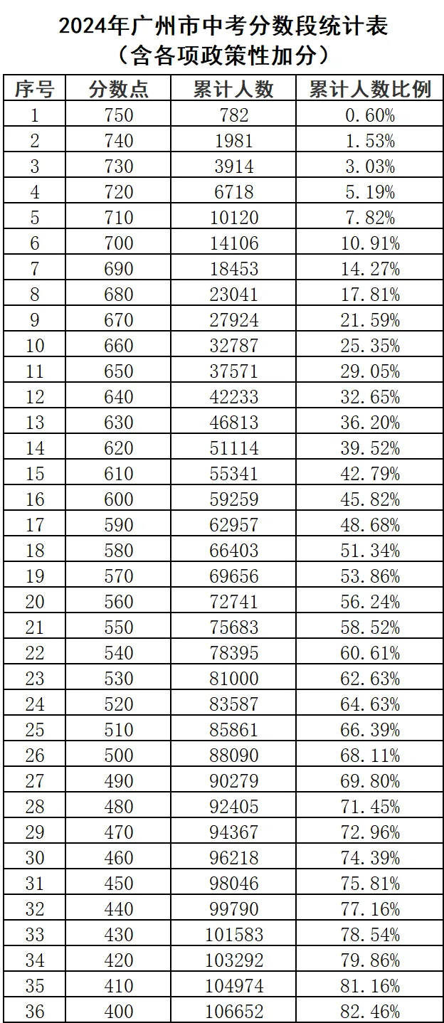 2024年广州市中考分数段统计表