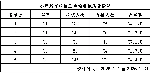 2026年1月份,全市共有1728人次参加汽车类驾驶人科目考试,涉及4家驾驶培训机构,现对考试情况和驾校考试质量进行通报如下: