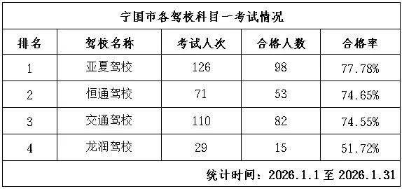 2026年1月份宁国市各驾校参加科目一考试共计336人次,平均合格率为73.81%,各驾校合格率排名如下: