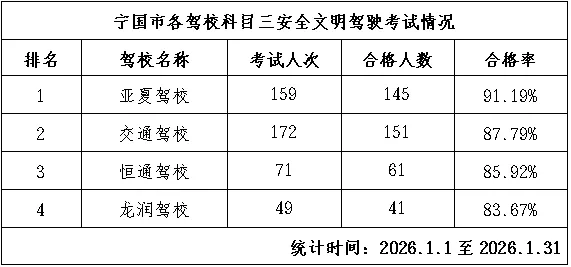 2026年1月份宁国各驾校参加科目三安全文明驾驶考试共计451人次,平均合格率为88.25 %,各驾校合格率排名如下: