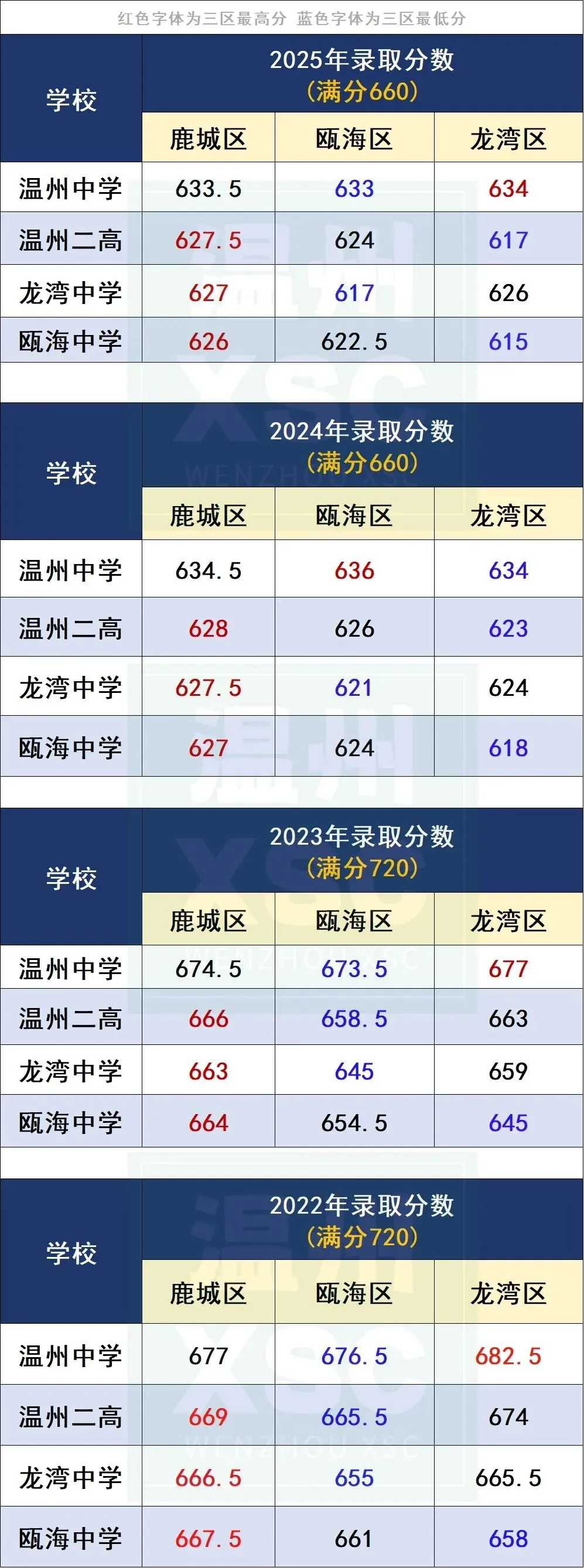 除了温州中学,另外3所重点高中在鹿城区近年的录取分数线始终为三区最高。