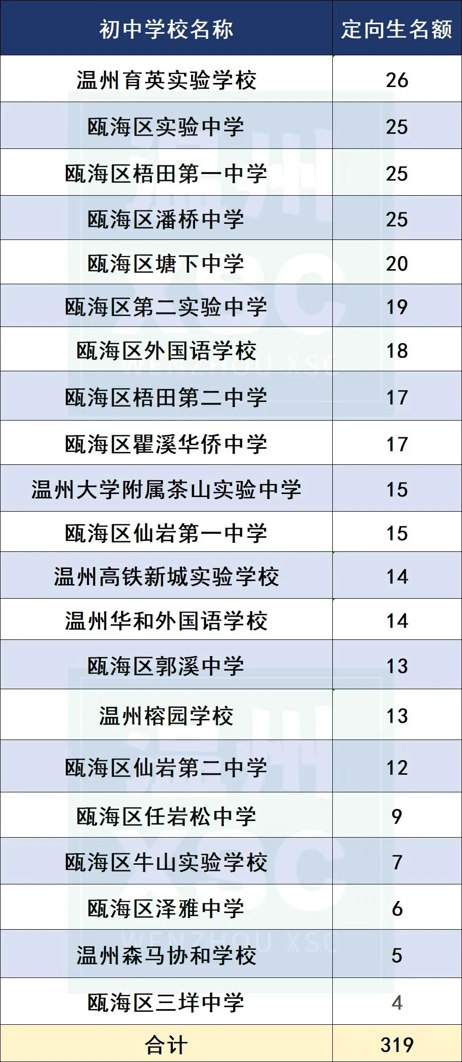 2025年瓯海中学定向生名额分配