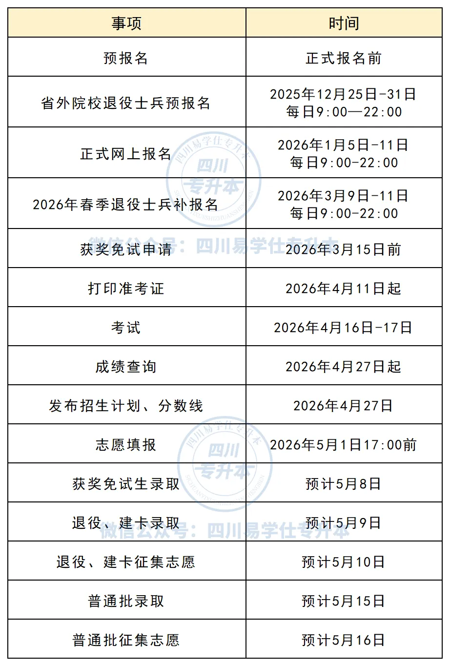 2026年四川专升本后续还有哪些环节要注意?招生院校、招生计划什么时候发?2026年春季退役的大学生士兵有一次补报名的机会,其他考生没有补报名。参加考试的考生(普通考生、建档立卡考生、退役大学生士兵),要注意准考证打印时间和考试时间。准考证由考生登录报名系统,自行打印。公布专升本成绩的同时,考试院还会发布今年的招生计划、分数线,紧接着就是填报志愿。后续每一个流程都会提前提醒大家,请持续关注公众号消息。易学仕专升本考前集训营包含:考前直播课、习题课、模考课,均赠送配套纸质资料,比如教材、习题册、模拟卷等。班主任监督学习,授课老师批改作业、班级群内随时答疑。