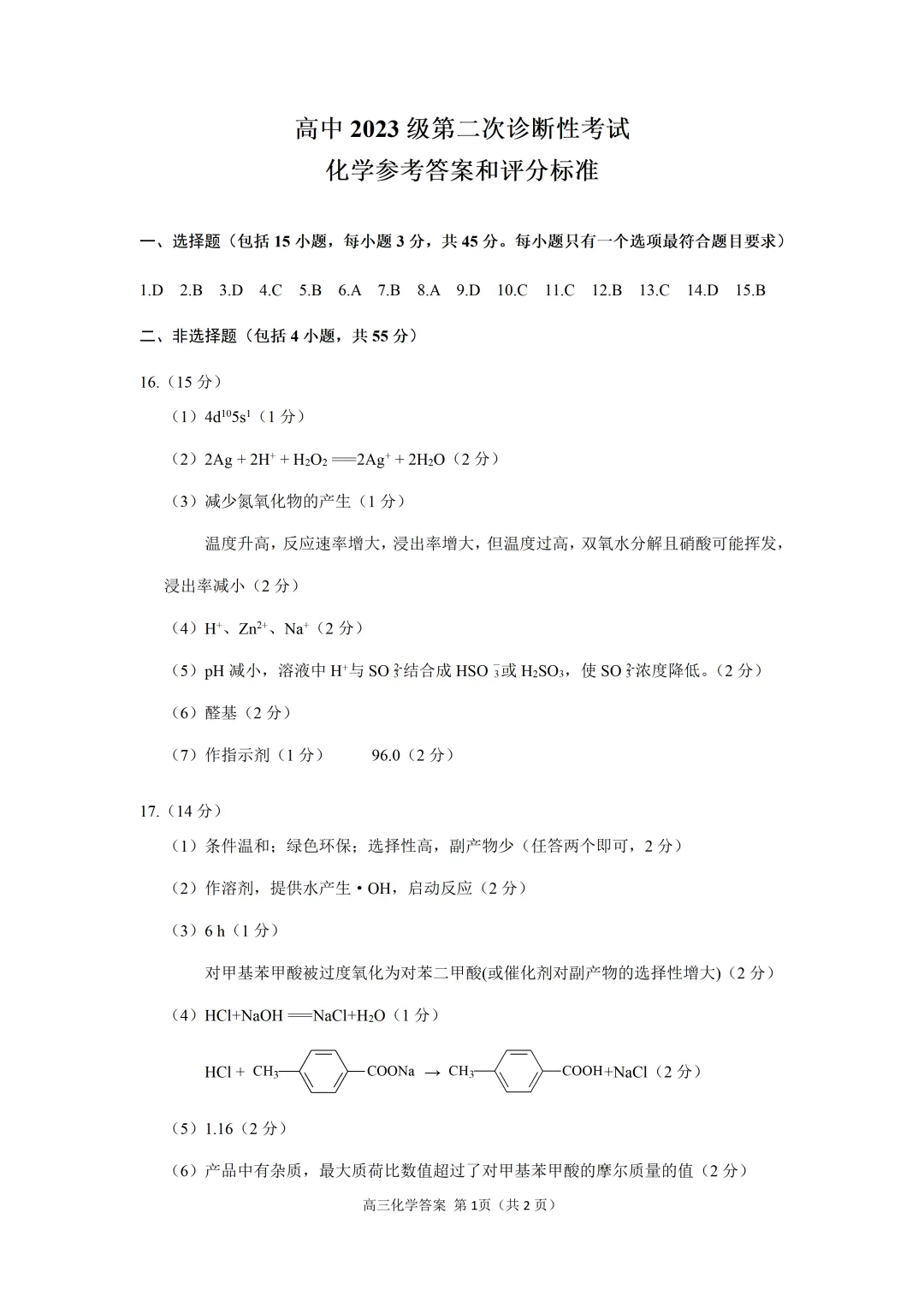 绵阳市高中2023级第二次诊断性考试化学试题与答案,下载方式如下: