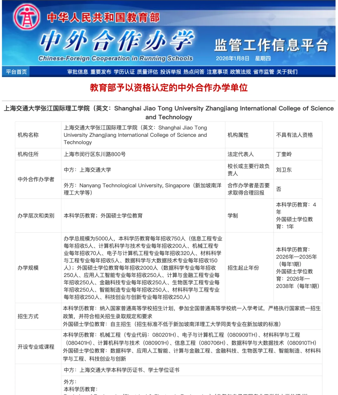 上海交通大学张江国际理工学院是由世界顶尖大学——上海交通大学(中国)与南洋理工大学等(新加坡)合作的办学机构。办学层次分为本科学历教育(4年)和外国硕士学位教育(1年),除本科教育外,学院还计划开设多个一年制硕士项目(如数据科学、应用人工智能、计算与金融工程等),形成完整的国际化本科至硕士培养体系。该学院将于2026年启动首届招生,每年招收本科生750人,外国硕士学位教育每年招收2000人,总办学规模高达5000人。