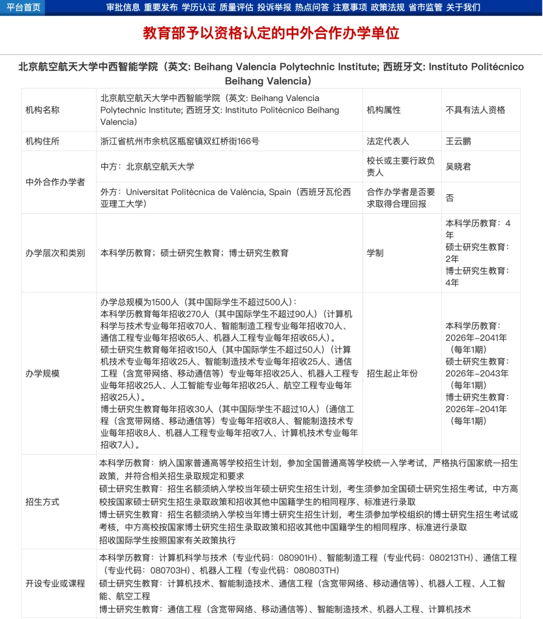 北京航空航天大学中西智能学院旨在联合北京航空航天大学和西班牙瓦伦西亚理工大学两所高校的优势办学资源,面向本科、硕士和博士完整学历教育体系进行培养。中西智能学院是国内首个联合西班牙高校设立、覆盖本硕博完整学历体系的中外合作办学机构。学院办学地点位于浙江省杭州市北航杭州国际校园。