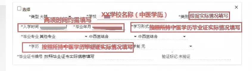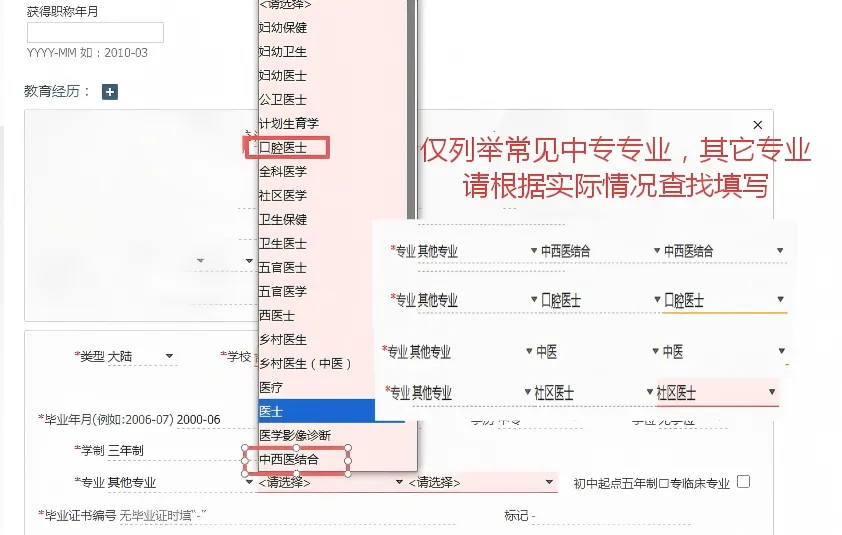 1.报考西学中类别:毕业专业填写为“中西医结合”(在其他专业中选择)专业,学制填“无”,学习形式填“按照所持中医学历毕业证实际情况填写”,学历填“按照中医学历实际情况填写”,证书类型填“西医执业证”“西医注册证”及相应编号。如图填写: