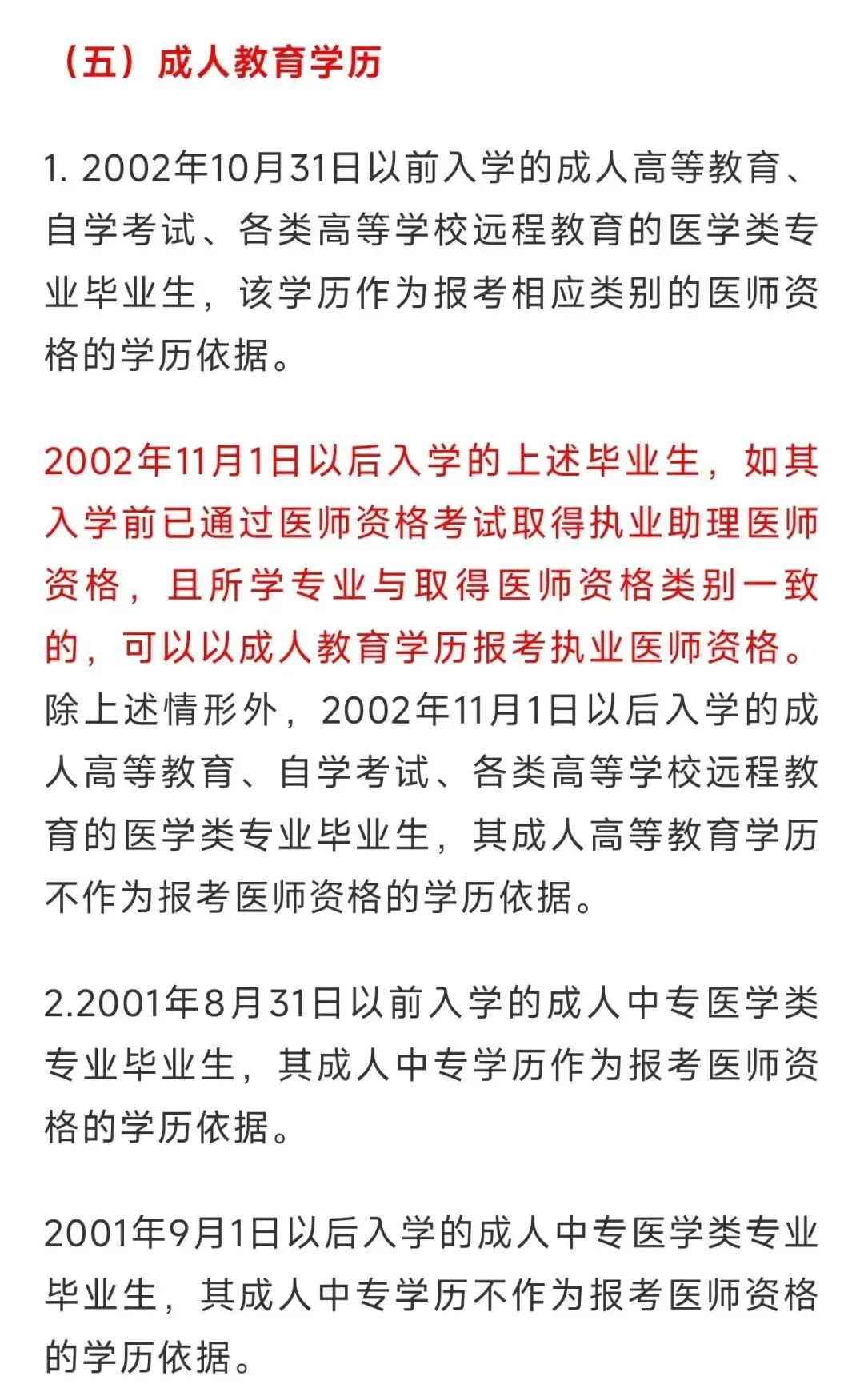 我们着重看红字部分,2002年之前的就不用看了,在座的各位如有成人本科学历,基本上都是2002年之后入学的。首先我们要明确一条,成人教育学历必须是取得助理医师资格后入学的,才能作为执业医师报考依据,这是前提。如果成人学历是助理医师资格取得前入学的,是不能作为报考执业医师的依据的。