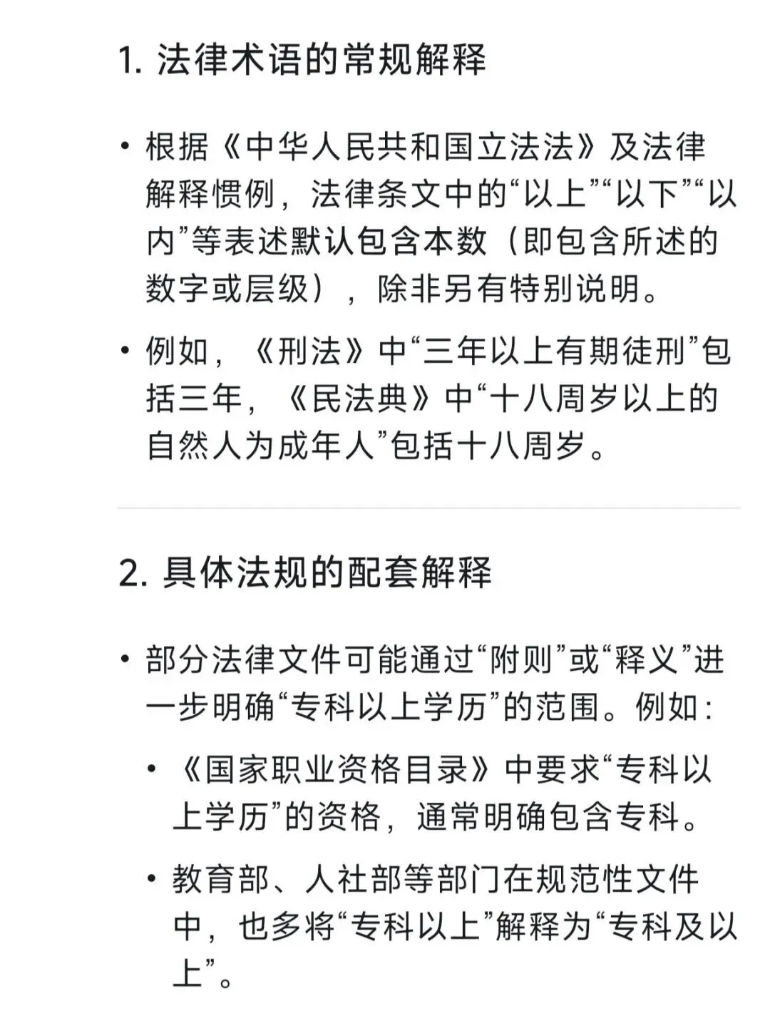 这里只说一点,也算是对之前发表言论做个纠正,文中说“取得国务院教育行政部门认可的…………专科以上学历”,专科以上,这个词汇,根据法律法规行文规定及习惯来说,专科以上是包含专科的。高升专与专升本,均属于“专科以上”表述的学历。