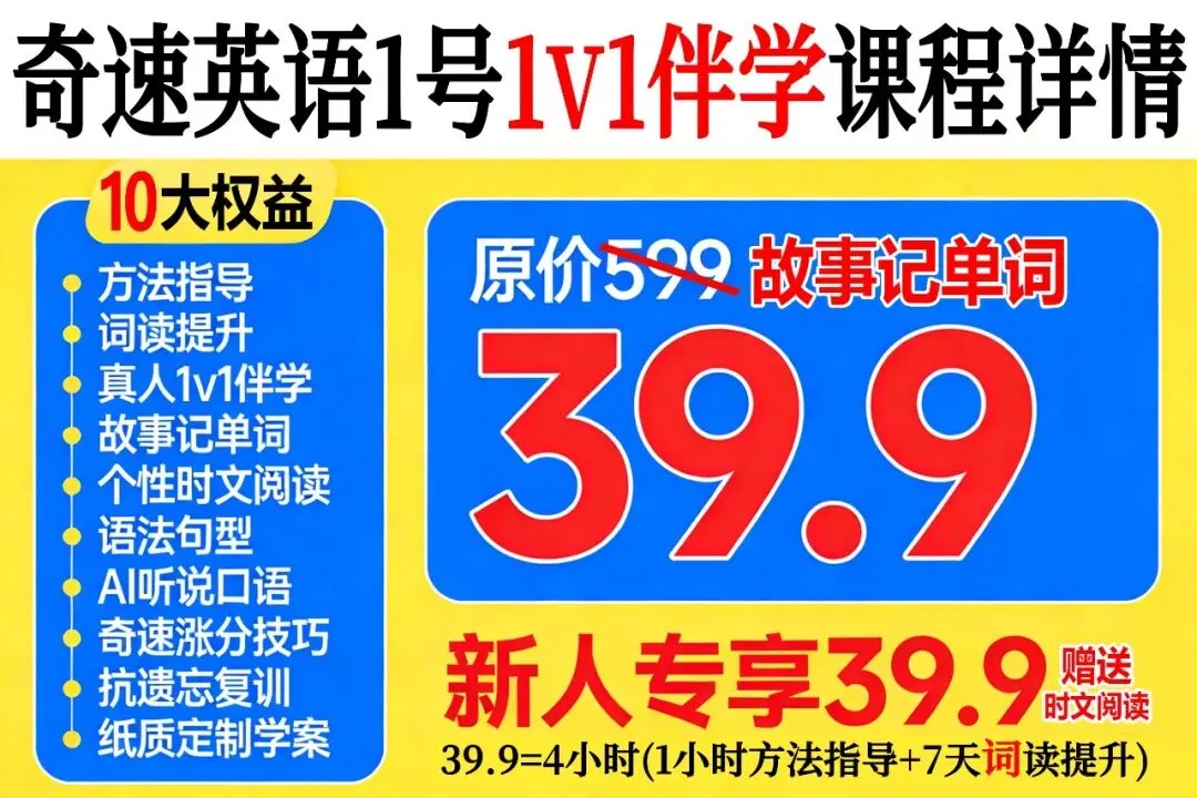 这门课程原价599元,现在新人专享仅39.9元,就能让孩子获得4小时核心学习内容——1小时真人1V1专属方法指导,精准拆解阅读理解满分技巧,结合孩子的学习情况定制专属学习方案;7天词读专项提升,从词汇积累到阅读解题,全方位夯实基础。更有10大重磅权益加持:奇速独家故事记单词法,让孩子轻松记单词、快速扩词汇;个性时文阅读精准匹配孩子的学习水平和薄弱点;语法句型、AI听说口语同步提升;还有抗遗忘复训、纸质定制学案、奇速独家涨分技巧倾囊相授,报名即赠送时文阅读资源。
