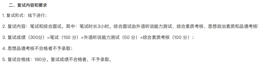 复试成绩满分300分,由三部分组成:专业课笔试(150分)+外语听说能力测试(50分)+综合素质考核(100分)