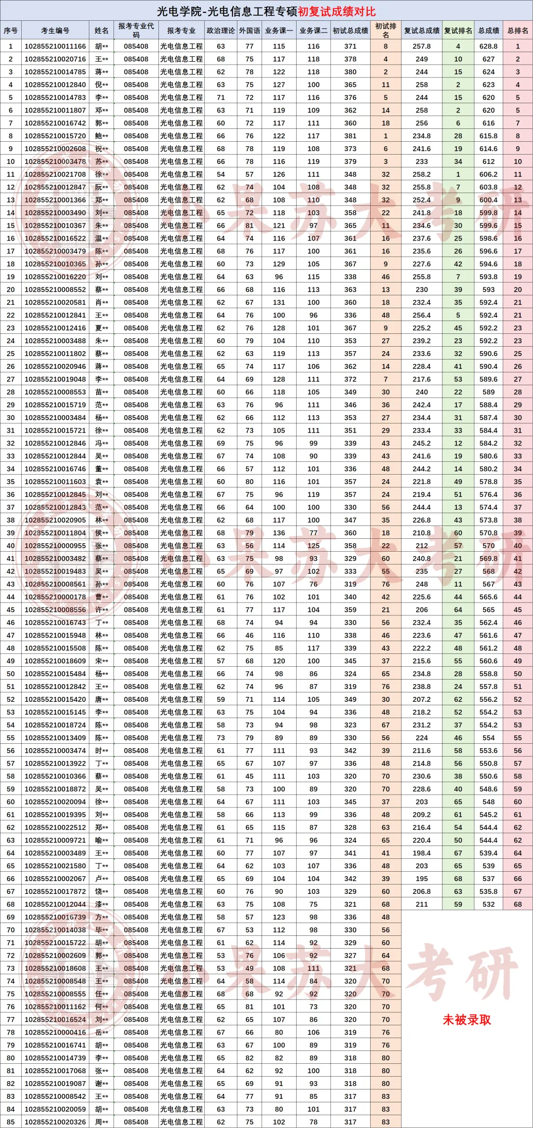 ③如果初试成绩高,但是复试没有好好准备,复试分数不高,那最终的排名就会在中等靠后的位置,甚至可能被初试考的不好的同学超越,挤出录取名额。