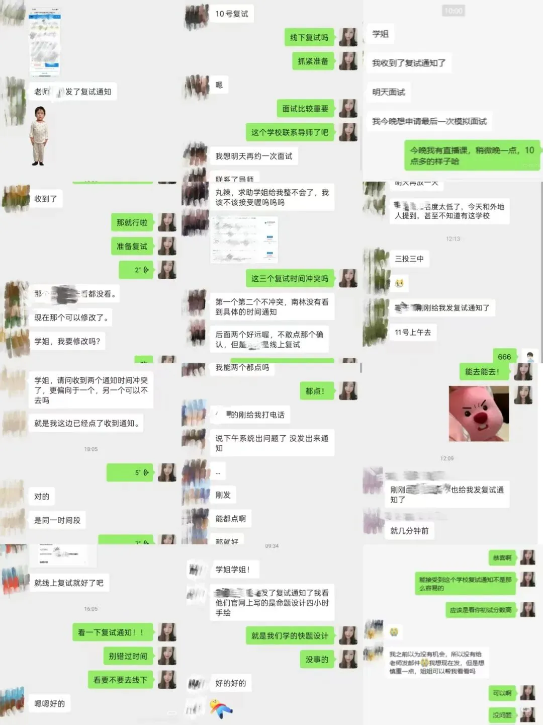 面试是复试的重要环节,机构班里有经验丰富的学长学姐全程助力我们,在面试前,我还进行了多次模拟面试,按照复试流程进行全真模拟,让他们指出我的不足之处,如语速过快、回答问题不条理等。通过不断地模拟练习,我的面试表现越来越自信、从容。