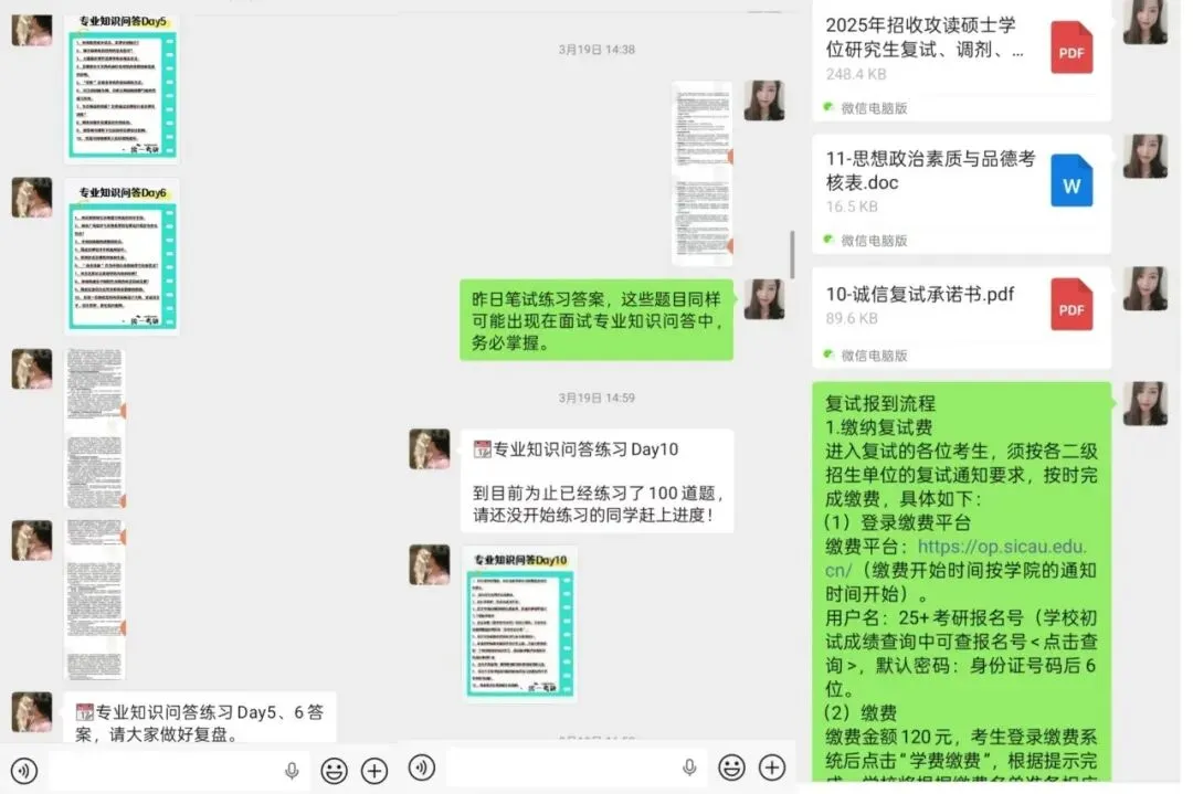 每日在班级群里发布专业知识问答练习,及时提醒复试关键事项。