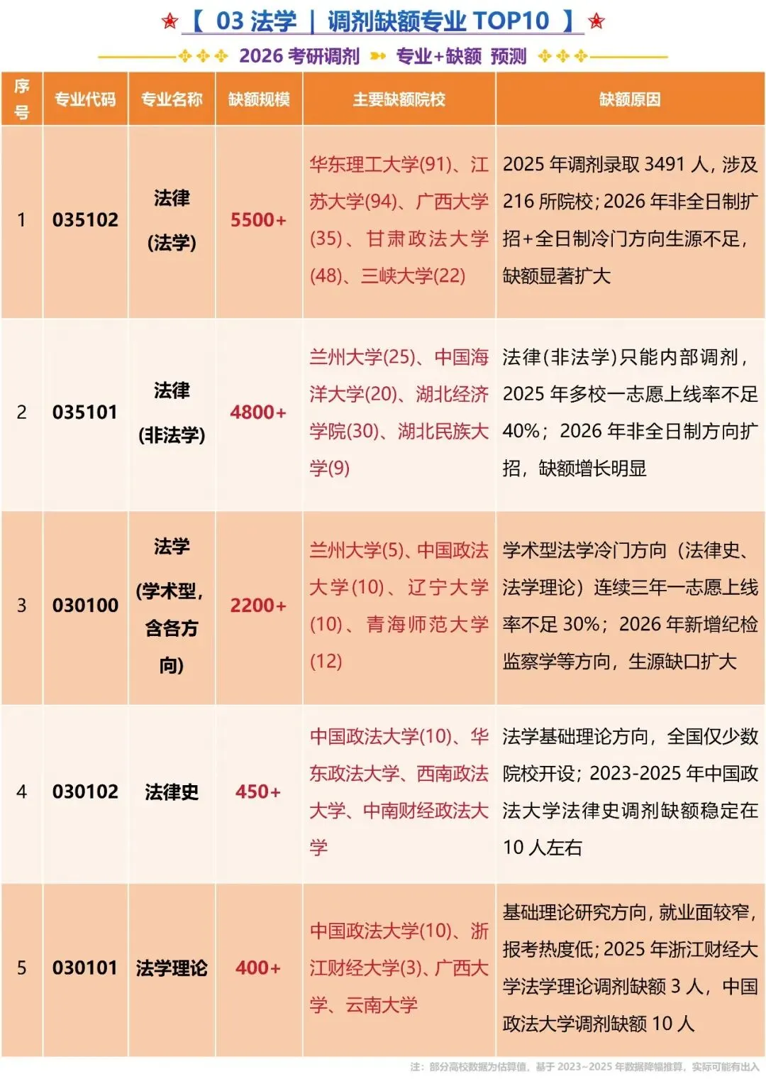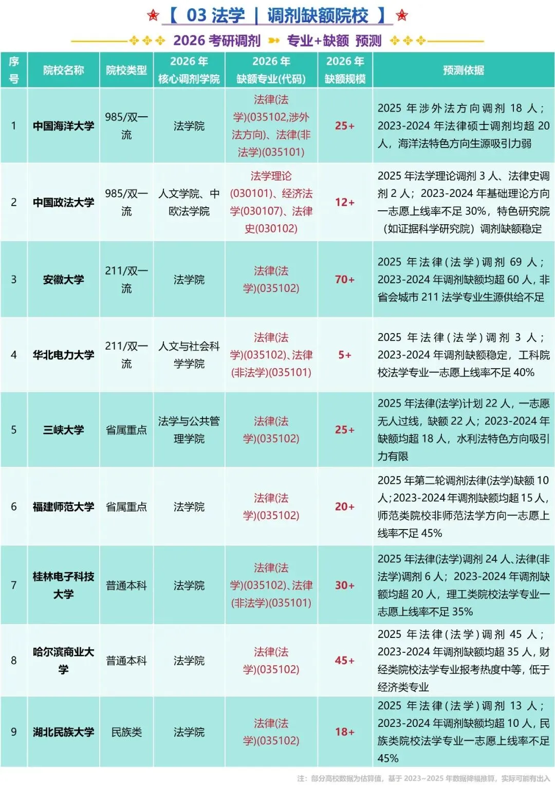 :甘肃政法大学、华东政法大学(非全日制)等地方强校缺额稳定(增长10-15%)