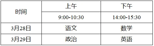 (3)考试科目及分值:语文、数学、政治、英语四科,每科满分150分,四科满分为600分。使用国家通用语言文字作答。
