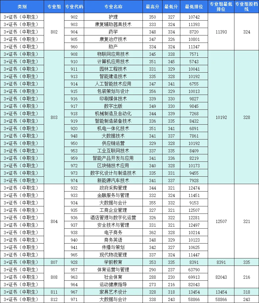3+证书录取最高分为:363分,专业为:计算机网络技术