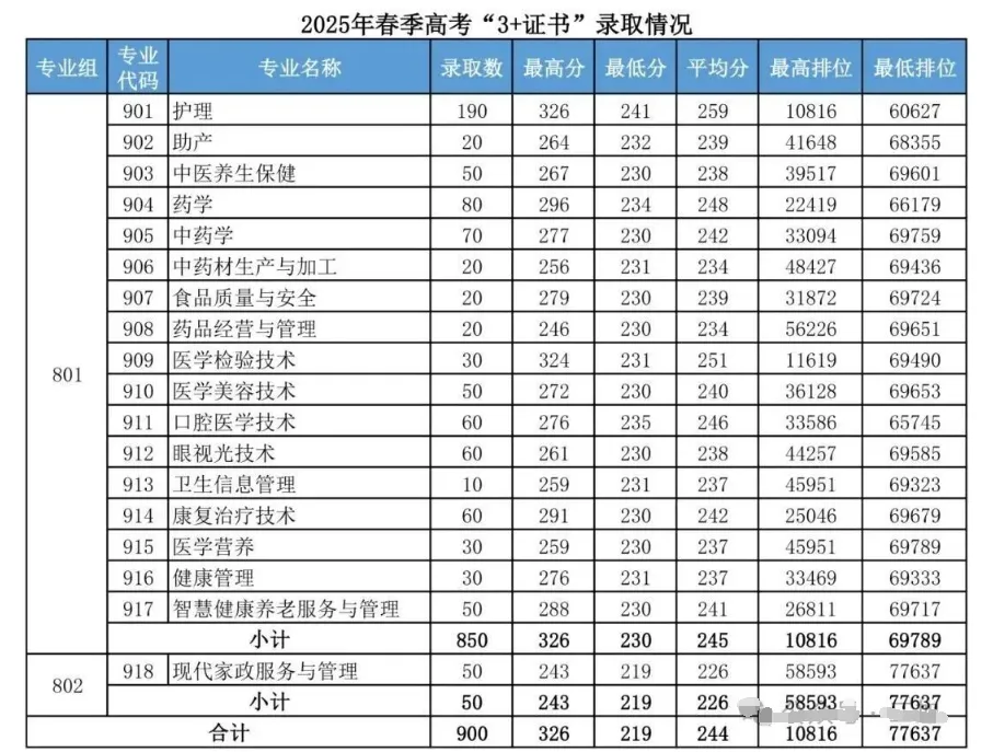 3+证书录取最高分为:295分,专业为:中医学